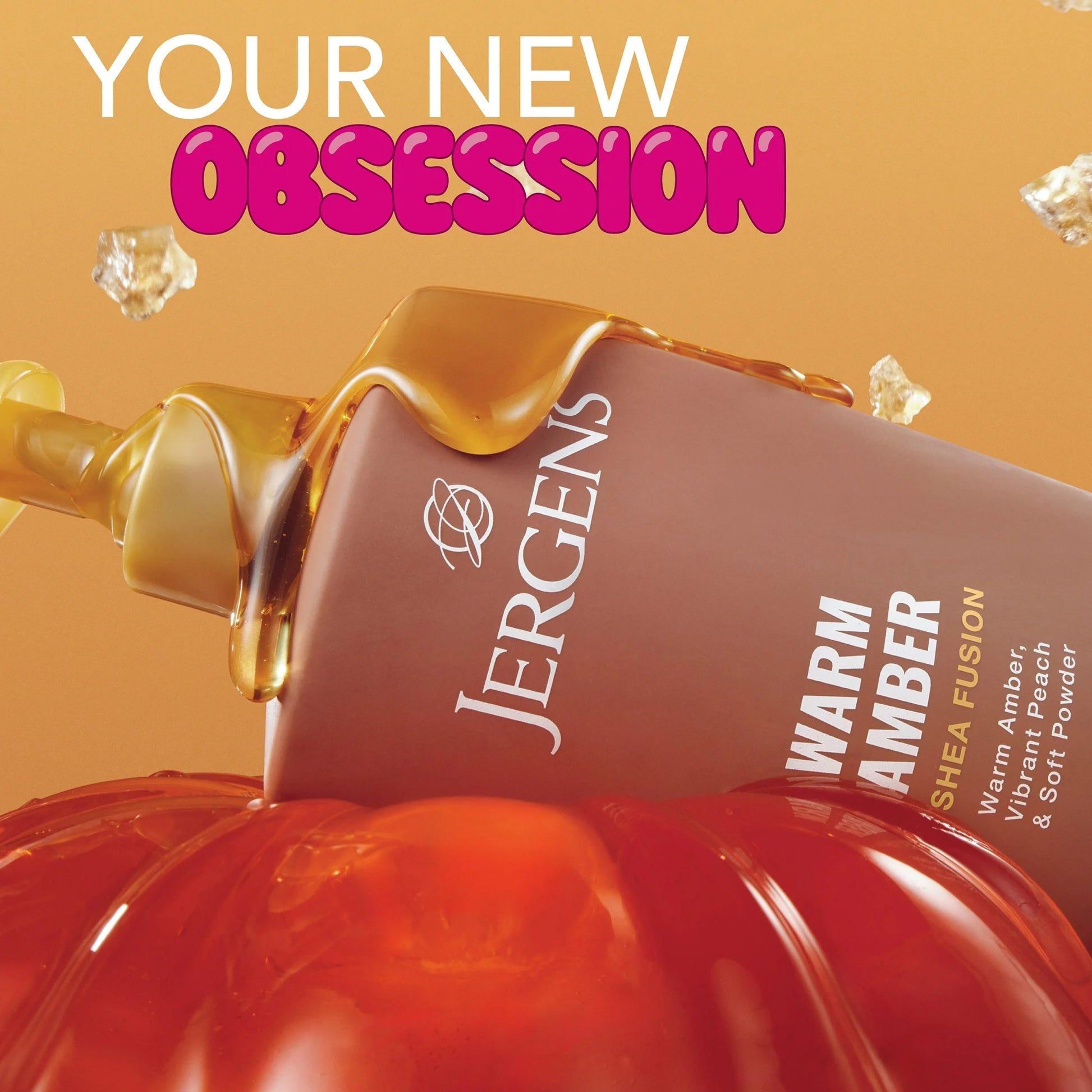 This moisturizer is crushing it–one amber drip at a time. Jergens Shea Fusion Warm Amber Body Lotion brings the warm scent of amber, soft powder and vibrant peach to touchable nourishing moisture. Blended with naturally derived African shea butter and Vitamin E, this moisturizer nourishes your skin to feel smooth and supple. It helps your skin feel soft as a cloud. Get touchably smooth hydration that lasts all day–up to 24 hours! Indulgent, scented lotion that really crushes it.